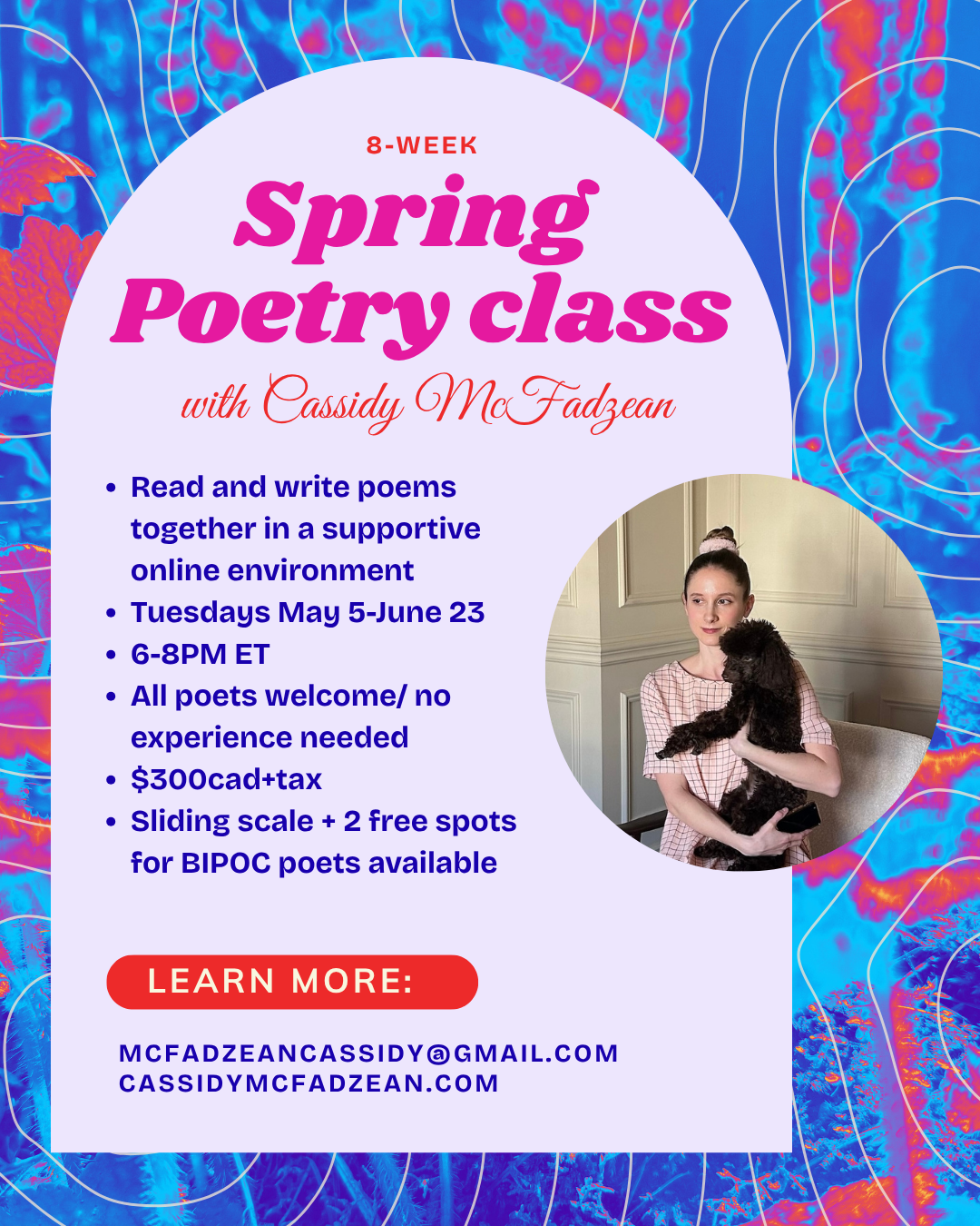 Sliding scale and scholarships for BIPOC poets are available for each course. To apply for the scholarship, email a little about your writing practice, why you want to take the class, and a 5-page sample to mcfadzeancassidy@gmail.com